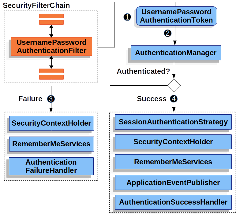 When the username and password are submitted, the UsernamePasswordAuthenticationFilter authenticates the username and password. The UsernamePasswordAuthenticationFilter extends AbstractAuthenticationProcessingFilter, so the following diagram should look pr